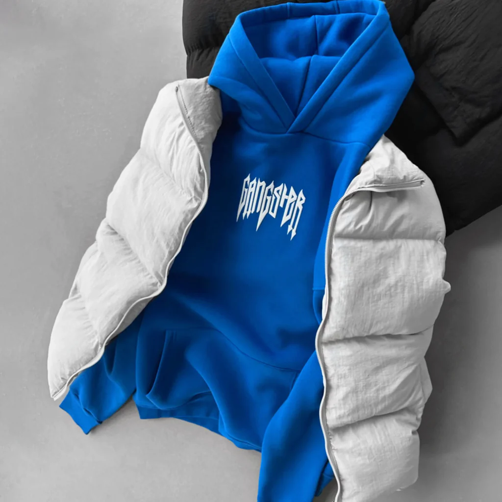 Turn heads with this Men’s Blue “Gangster” Graphic Hoodie — a fearless streetwear essential featuring bold red typography and a striking ski mask print on the back. Built for confidence and comfort, this oversized hoodie makes a statement wherever you go.