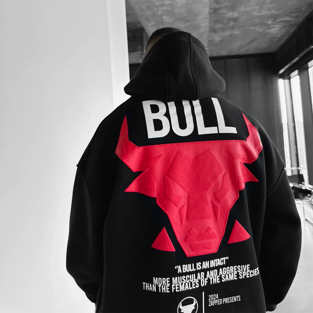 Make a bold and powerful statement with this Men’s Black Bull Graphic Hoodie, designed for modern streetwear enthusiasts. Featuring a large 3D bull emblem and bold “BULL” lettering on the back, this hoodie blends standout visual impact with everyday comfort. Perfect for casual wear, gym fits, airport looks, and urban street style.