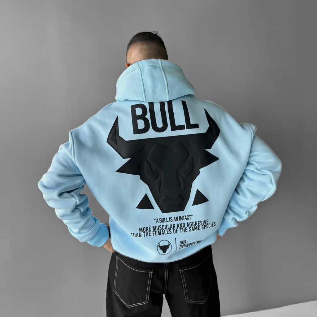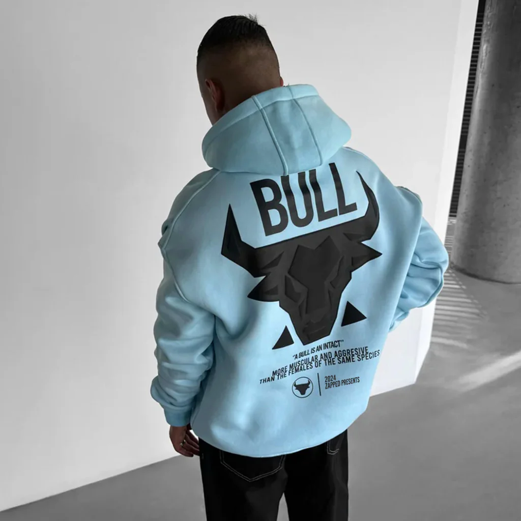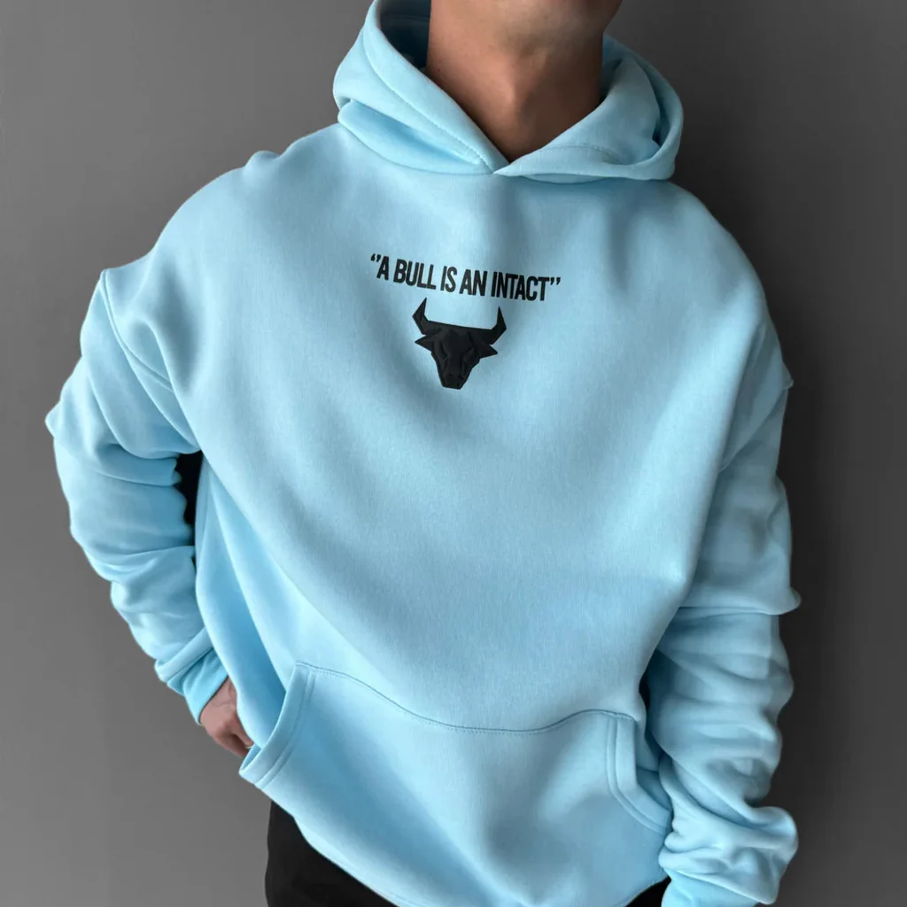 Unleash bold energy with the men’s Bull Oversized Hoodie in Sky Blue, featuring a striking black bull graphic and empowering typography. Designed for those who lead with strength and confidence, this hoodie combines premium comfort with street-ready attitude — a standout choice for modern urban wear in the UAE.